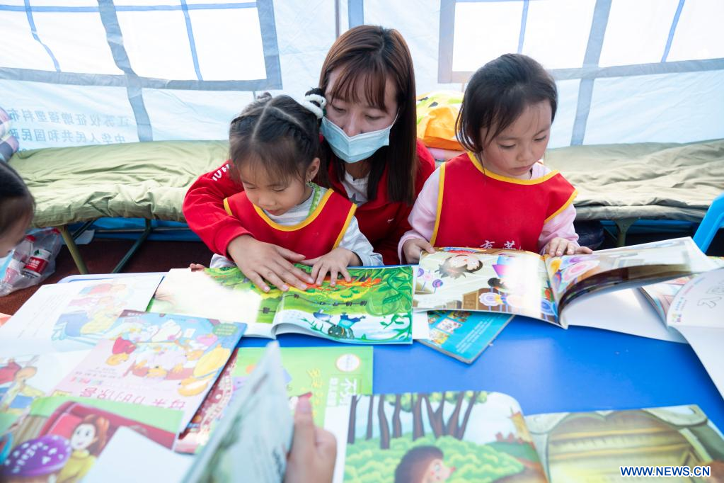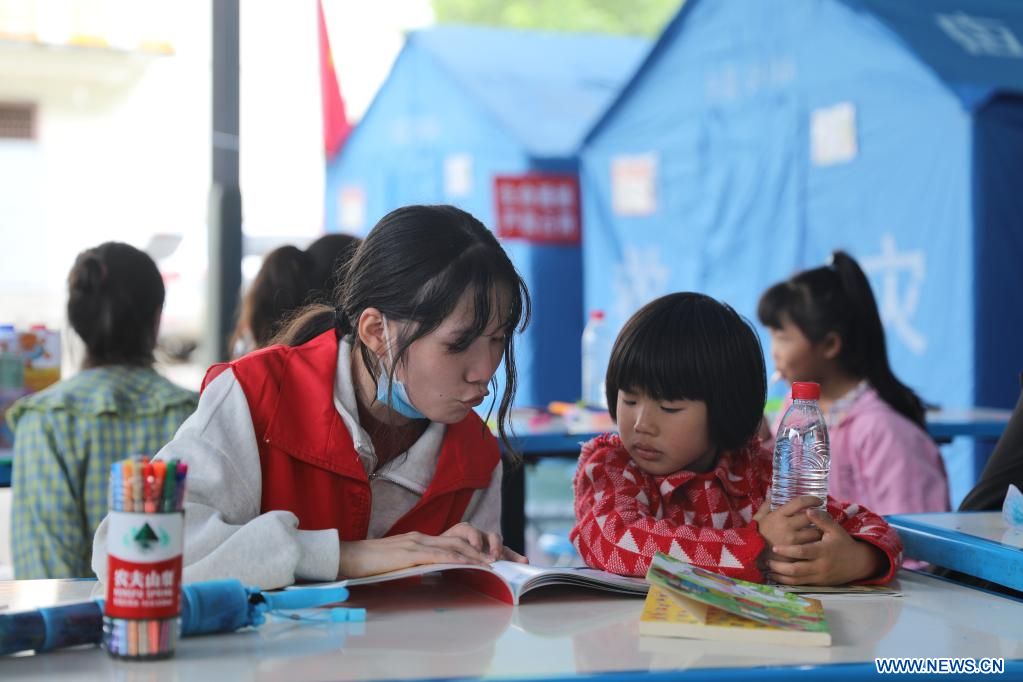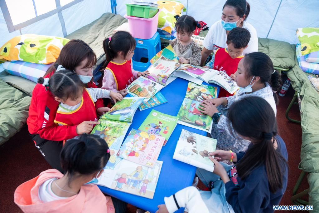 YA'AN, 9 septembre (Xinhua) -- Des enseignants apprennent aux enfants à lire dans un abri de secours à la suite du séisme, le 9 septembre 2022, dans le bourg de Shimian à Ya'an, de la province chinoise du Sichuan (Photo : Cai Yang)