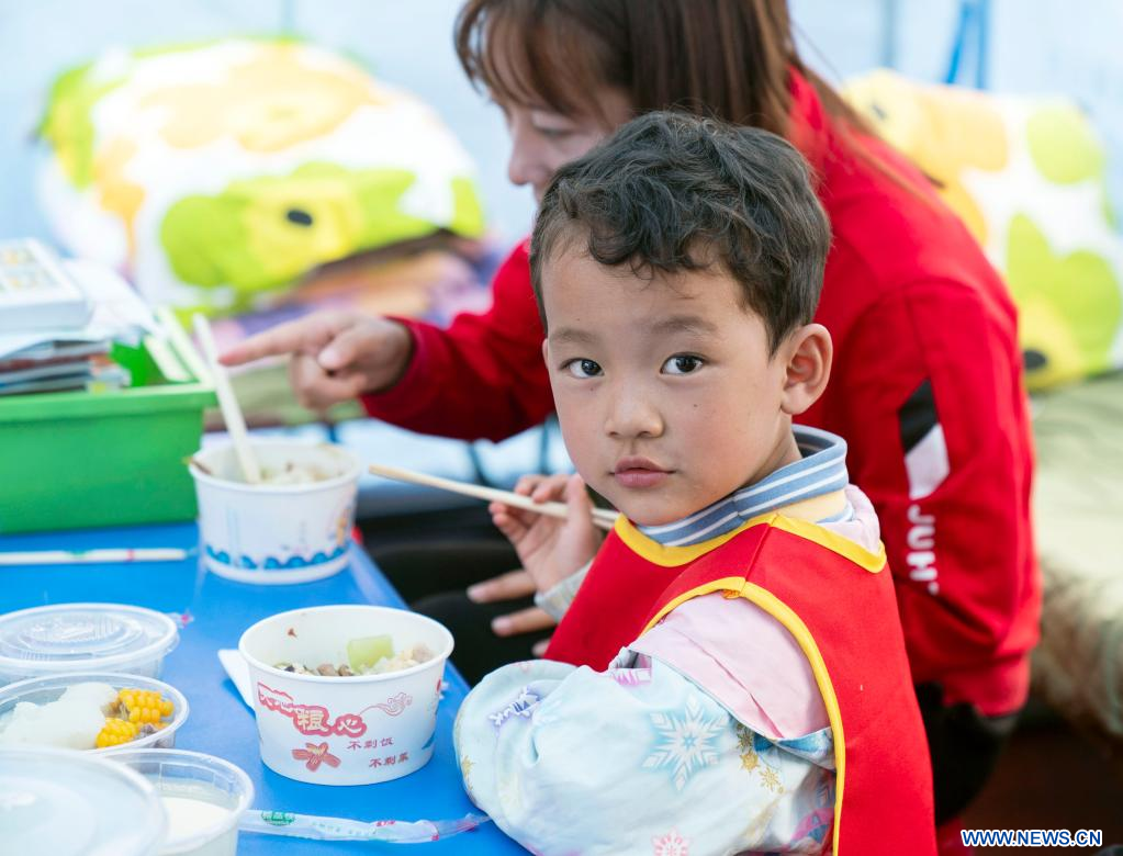 YA'AN, 9 septembre (Xinhua) -- Des enfants prennent leurs repas dans un abri de secours à la suite du séisme, le 9 septembre 2022, dans le bourg de Shimian à Ya'an, de la province chinoise du Sichuan (Photo : Cai Yang)