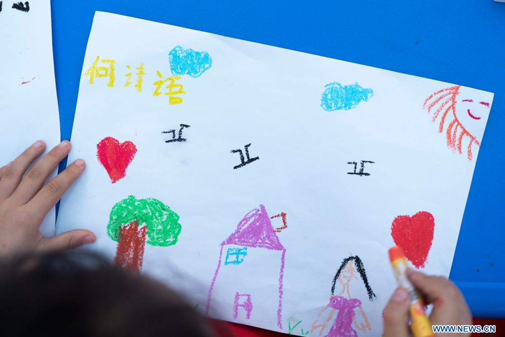 YA'AN, 9 septembre (Xinhua) -- Un enfant dessine dans un abri de secours à la suite du séisme, le 9 septembre 2022, dans le bourg de Shimian à Ya'an, de la province chinoise du Sichuan (Photo : Cai Yang)