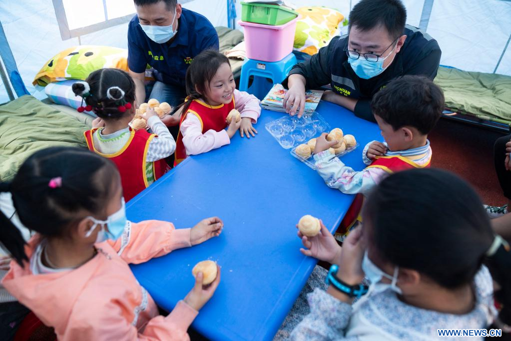 YA'AN, 9 septembre (Xinhua) -- Des travailleurs apportent des gâteaux de la Lune aux enfants dans un abri de secours à la suite du séisme, le 9 septembre 2022, dans le bourg de Shimian à Ya'an, de la province chinoise du Sichuan (Photo : Cai Yang)