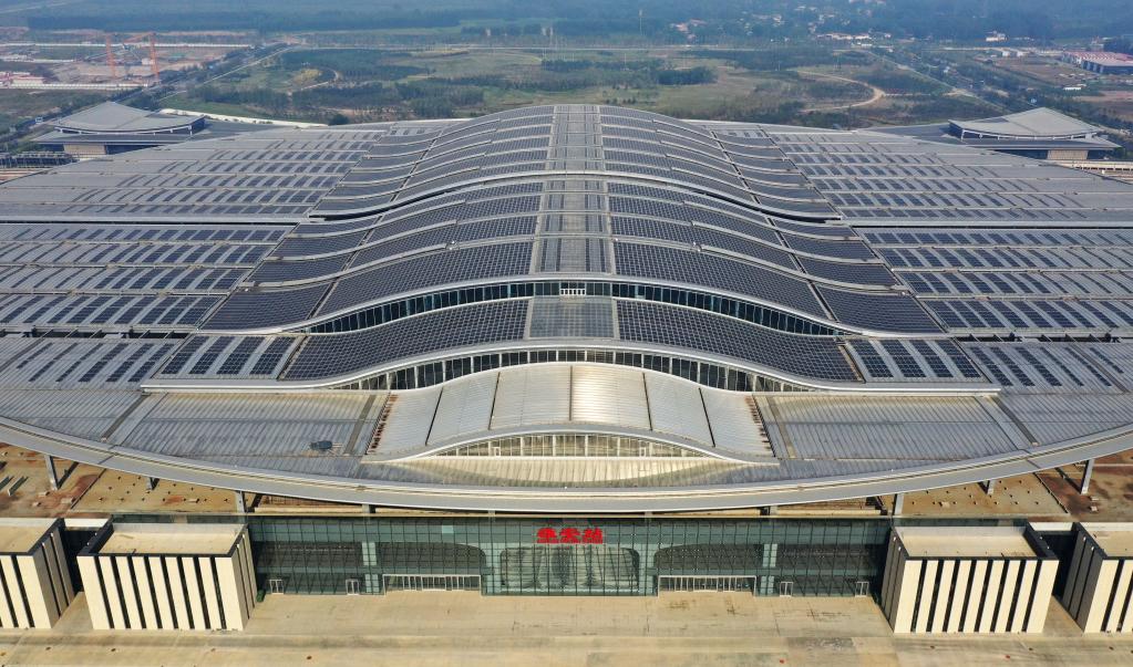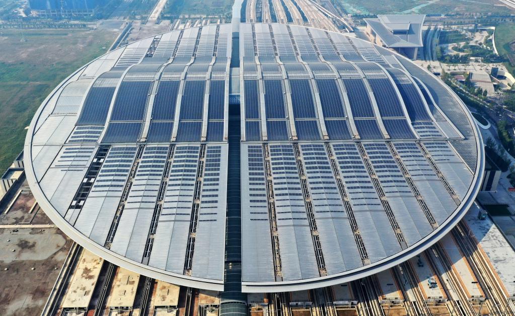 Photo aérienne de la centrale photovoltaïque distribuée sur le toit de la gare de Xiong'an, dans la Nouvelle Zone de Xiong'an, de la province chinoise du Hebei (nord), le 9 septembre 2022. (Photo : Xing Guangli)