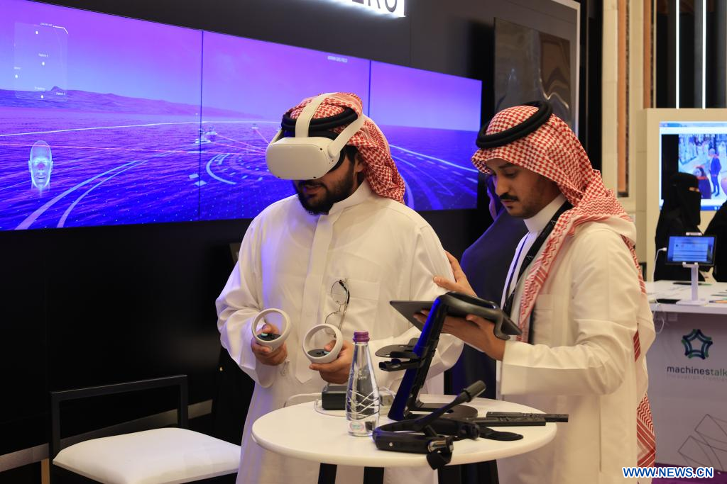 RIYAD, 13 septembre (Xinhua) -- Un visiteur expérimente un casque de réalité virtuelle lors du Sommet mondial sur l'intelligence artificielle (IA) 2022 à Riyad, en Arabie saoudite, le 13 septembre 2022. Le sommet s'est ouvert mardi. (Xinhua/Hu Guan)