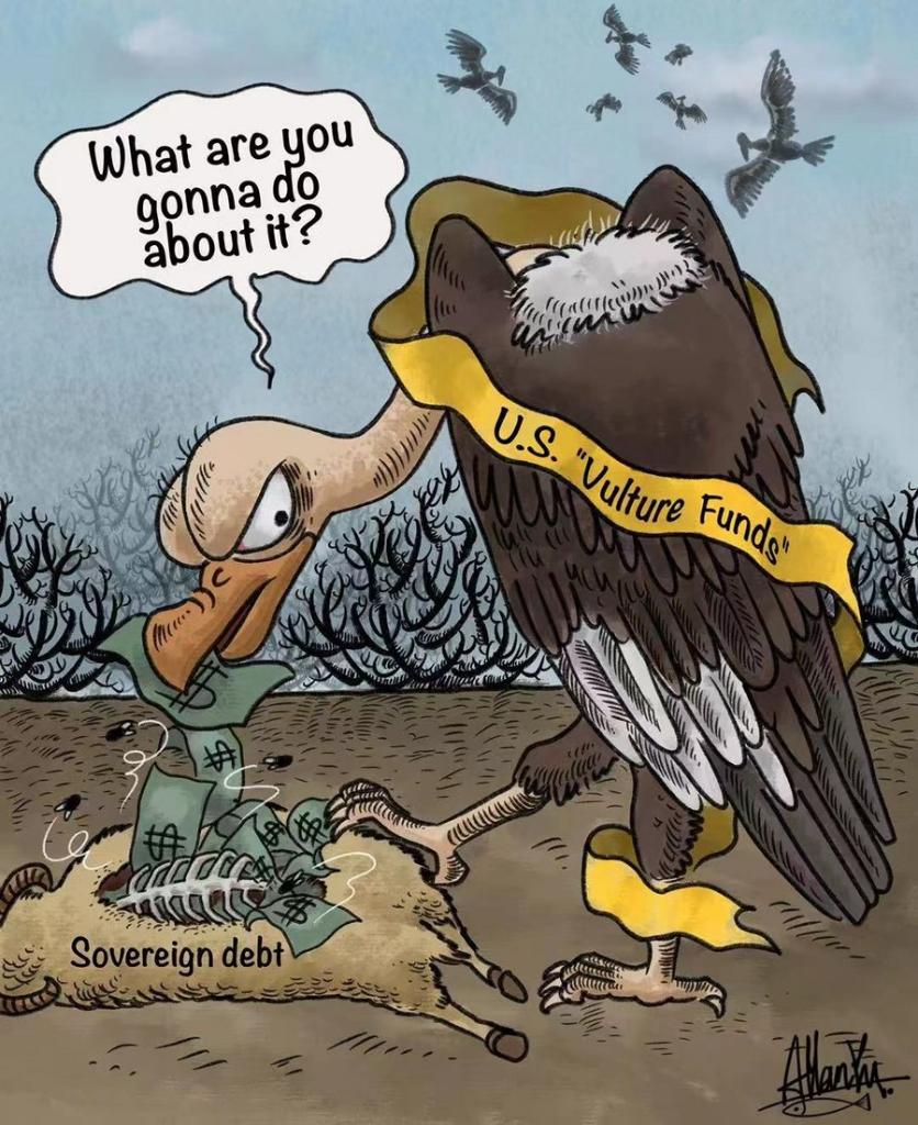 Ces fonds vautours, qui sont l'un des outils utilisés par les Etats-Unis pour assurer leur hégémonie financière, ont, au cours des dernières décennies, pris en otage l'Equateur, l'Argentine, le Pérou, le Vietnam et de nombreux autres pays en développement, tout en empochant des sommes astronomiques.