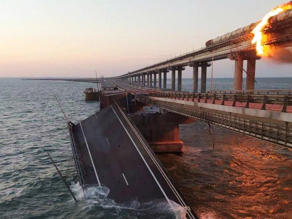 "Un camion en provenance de la péninsule de Taman a explosé sur la partie routière du pont de Crimée à 06H07 (03H07 GMT) aujourd'hui, provoquant l'incendie de sept citernes ferroviaires se dirigeant vers la péninsule de Crimée. Deux travées du pont routier se sont partiellement effondrées", a déclaré le Comité national russe de lutte contre le terrorisme dans un communiqué.