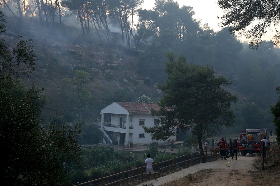 Des pompiers tentent d'éteindre un incendie à Cascais, au Portugal, le 16 juillet 2020. (Xinhua/Pedro Fiuza)
