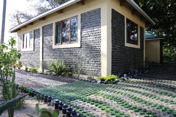 MAPUTO, 7 novembre (Xinhua) -- L'extérieur d'une maison construite par des bouteilles en verre recyclées à Makaneta, au Mozambique. (Xinhua/Nie Zuguo)