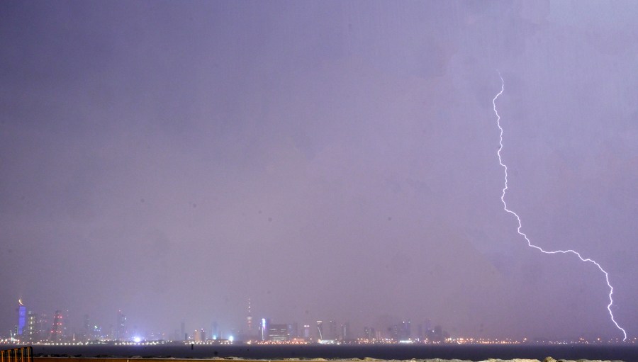 Photo prise le 11 novembre 2022 montrant un éclair au-dessus de la ville de Koweït, au Koweït. (Xinhua/Asad)