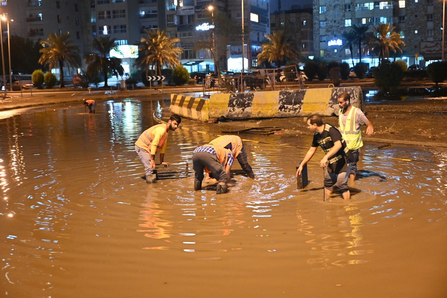 Des gens évacuent de l'eau dans une rue inondée de la ville de Koweït, au Koweït, le 11 novembre 2022. (Xinhua/Asad)
