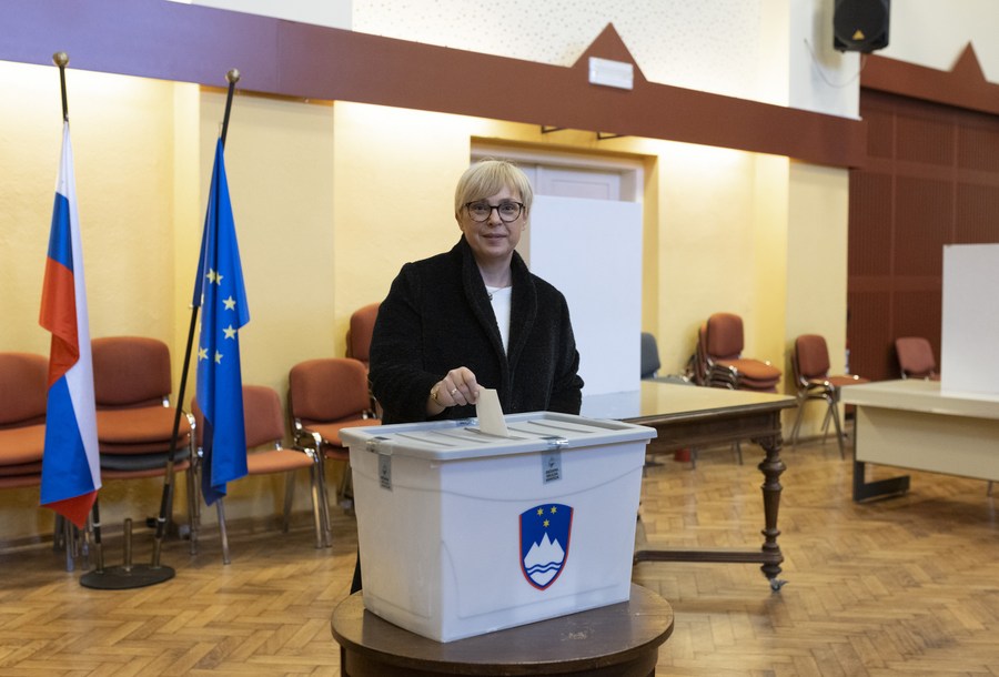 La candidate présidentielle Natasa Pirc Musar vote lors de l'élection présidentielle dans un bureau de vote de Radomlje, en Slovénie, le 23 octobre 2022. (Xinhua/Zeljko Stevanic)