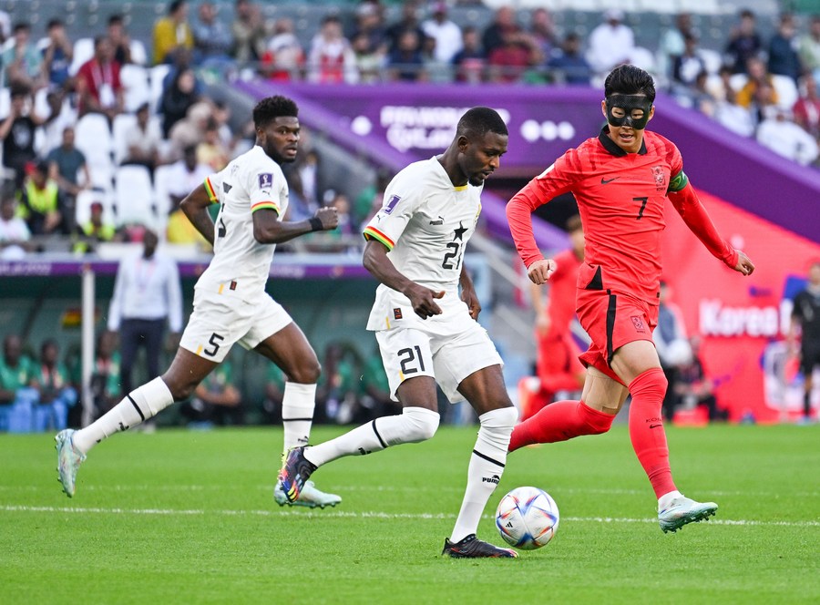 L'attaquant star sud-coréen Son Heung-min défend contre le Ghanéen Salis Abdul Samed (au centre) lors du match du groupe H entre le Ghana et la République de Corée à la Coupe du monde 2022 au stade Education City d'Al Rayyan, au Qatar, le 28 novembre 2022. (Xinhua/Xin Yuewei)