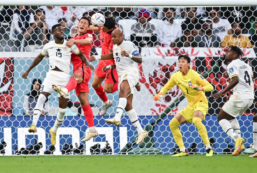 L'attaquant sud-coréen Cho Gue-sung marque un but de la tête lors du match du groupe H entre le Ghana et la République de Corée à la Coupe du monde 2022 au stade Education City d'Al Rayyan, au Qatar, le 28 novembre 2022. (Xinhua/Chen Cheng)