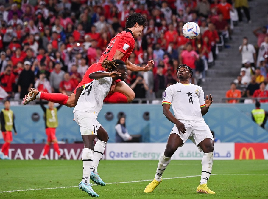 Le défenseur sud-coréen Kim Min-jae saute pour une tête lors du match du groupe H entre le Ghana et la République de Corée à la Coupe du monde 2022 au stade Education City d'Al Rayyan, au Qatar, le 28 novembre 2022. (Xinhua/Xiao Yijiu)