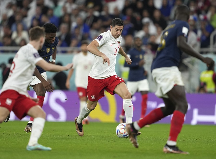 L'attaquant star polonais Robert Lewandowski (au centre) conduit la balle lors du huitième de finale entre la France et la Pologne, à la Coupe du monde de football 2022 au stade Al Thumama de Doha, au Qatar, le 4 décembre 2022. (Xinhua/Zheng Huansong)