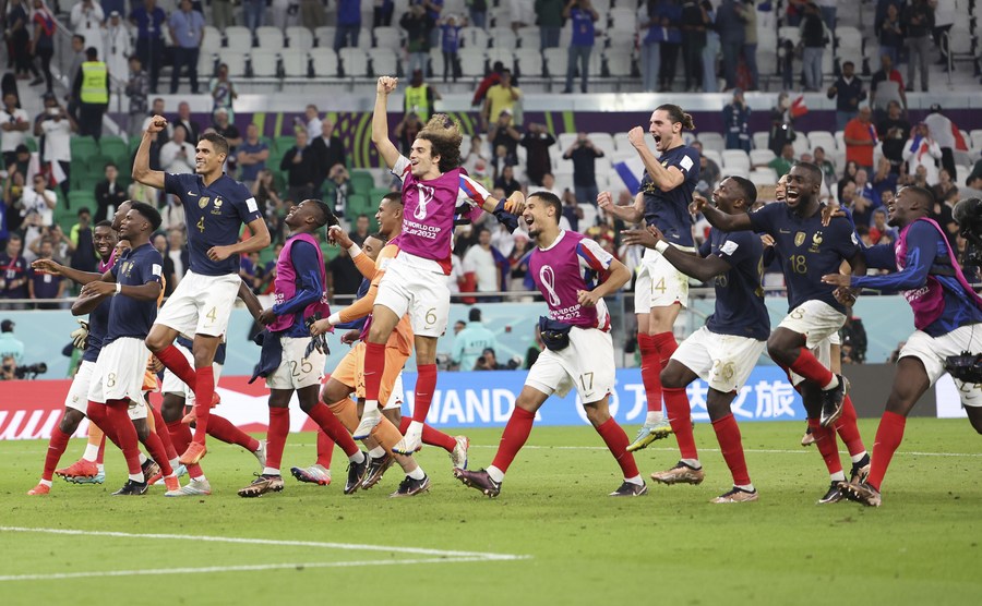 Les joueurs français célèbrent leur qualification pour les quarts de finale après leur victoire en huitième de finale face à la Pologne, à la Coupe du monde de football 2022 au stade Al Thumama de Doha, au Qatar, le 4 décembre 2022. (Xinhua/Cao Can)