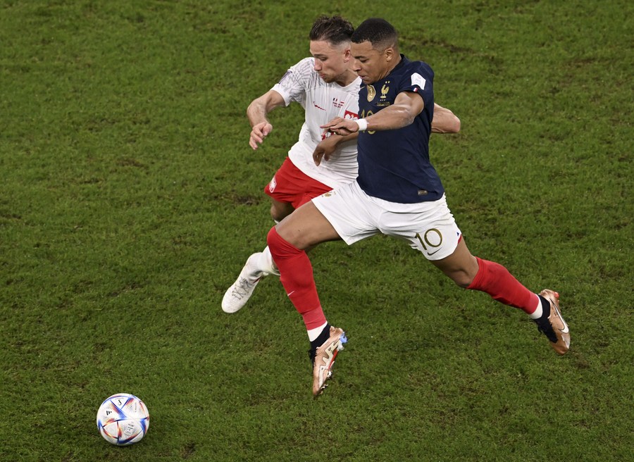 L'attaquant vedette de la France Kylian Mbappé aux prises avec le défenseur polonais Matty Cash lors du huitième de finale entre la France et la Pologne, à la Coupe du monde de football 2022 au stade Al Thumama de Doha, au Qatar, le 4 décembre 2022. (Xinhua/Xia Yifang)