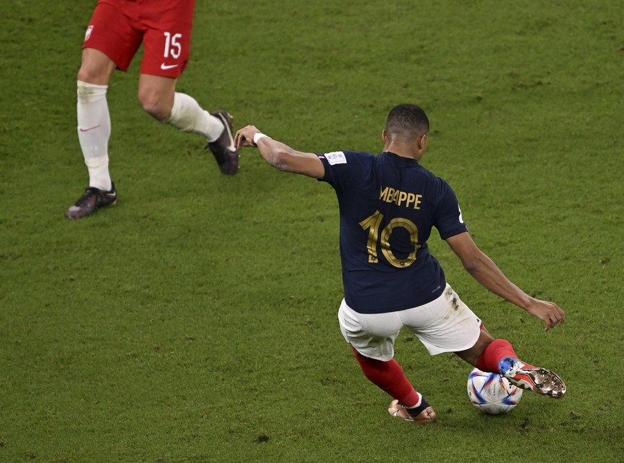 DOHA, 4 décembre (Xinhua) -- L'attaquant vedette de la France Kylian Mbappé tire et marque un but lors du huitième de finale entre la France et la Pologne, à la Coupe du monde de football 2022 au stade Al Thumama de Doha, au Qatar, le 4 décembre 2022. (Xinhua/Xia Yifang)