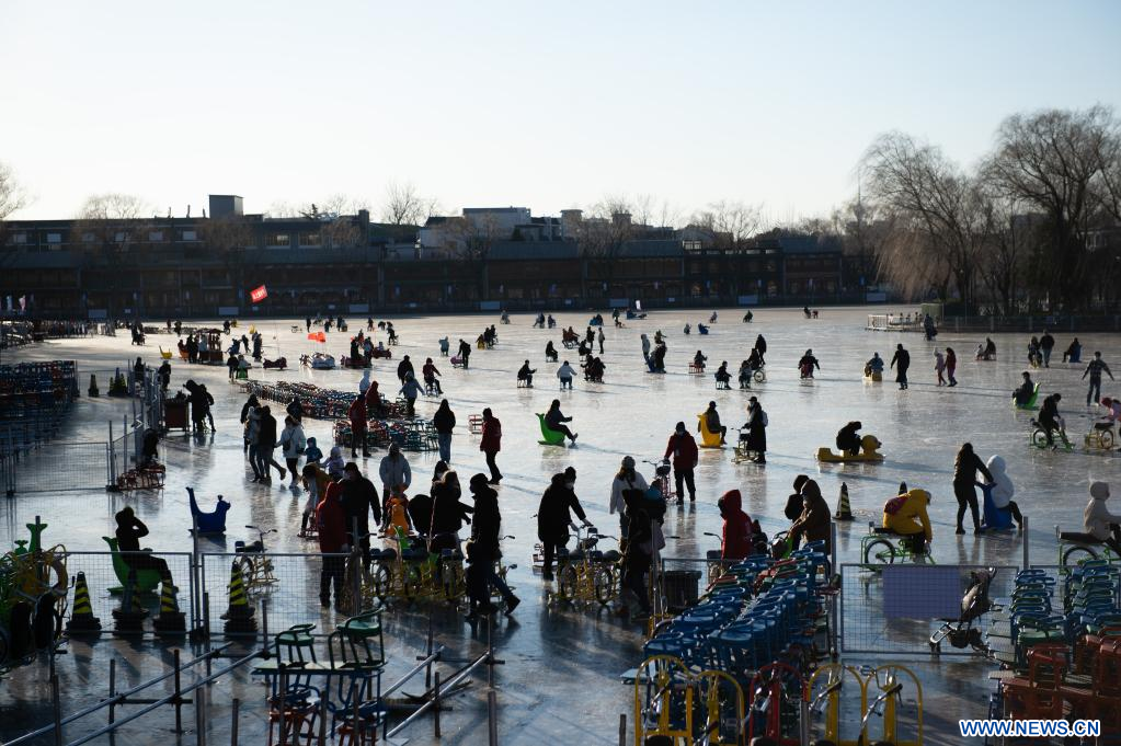 BEIJING, 28 décembre (Xinhua) -- Des gens s'amusent sur le lac gelé Shichahai transformé en patinoire, à Beijing, capitale chinoise, le 27 décembre 2022. La patinoire a été ouverte au public mardi. (Photo : Chen Zhonghao)