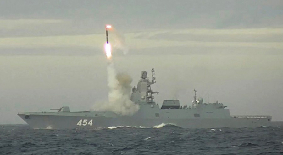 Cette capture d'écran publiée par le ministère russe de la Défense montre que la frégate Admiral Gorchkov effectue un tir d'essai d'un missile de croisière hypersonique Zirkon depuis la mer de Barents, le 28 mai 2022.