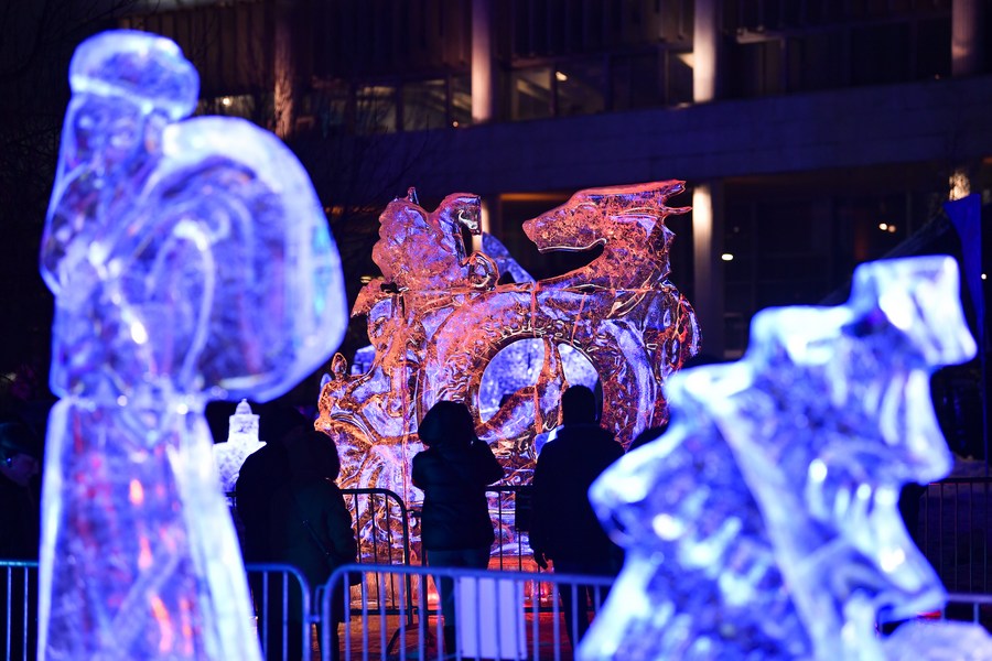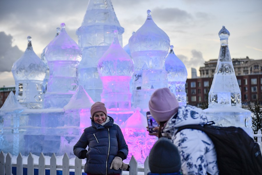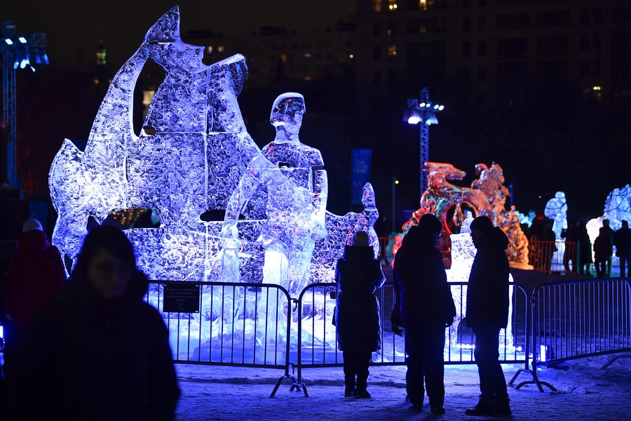 Des gens visitent une exposition de sculptures de glace dans un parc à Moscou, en Russie, le 5 janvier 2023. (Xinhua/Alexander Zemlianichenko Jr)