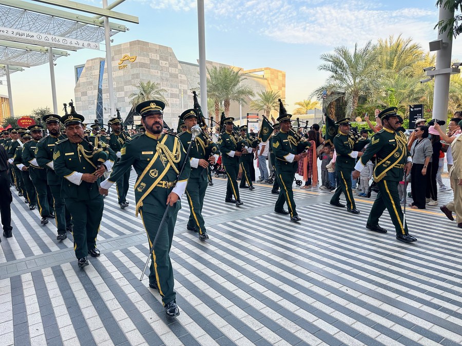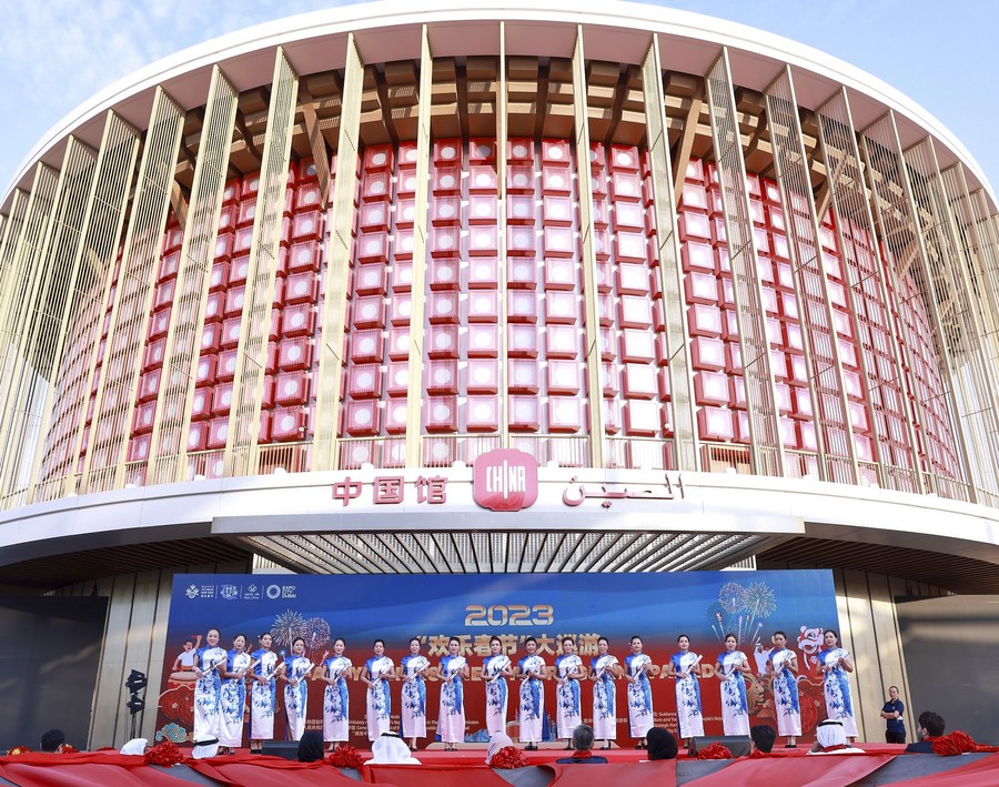 DUBAI, 16 janvier (Xinhua) -- Des musiciens présentent un spectacle devant le pavillon chinois à l'Expo City Dubaï, le site de l'Expo 2020 Dubaï, aux Emirats arabes unis (EAU), le 14 janvier 2023. Baptisée "Grande parade du Nouvel An chinois", la parade de deux kilomètres a attiré des millers de spectateurs. (Xinhua)