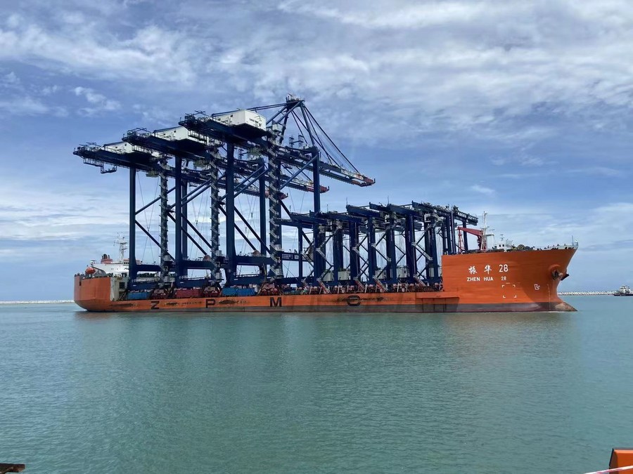 Photo prise le 1er juillet 2022 montrant le premier amarrage d'un navire, le Zhen Hua 28, dans le port en eau profonde de Lekki, alors en construction, à Lagos au Nigeria. (CHEC/via Xinhua)