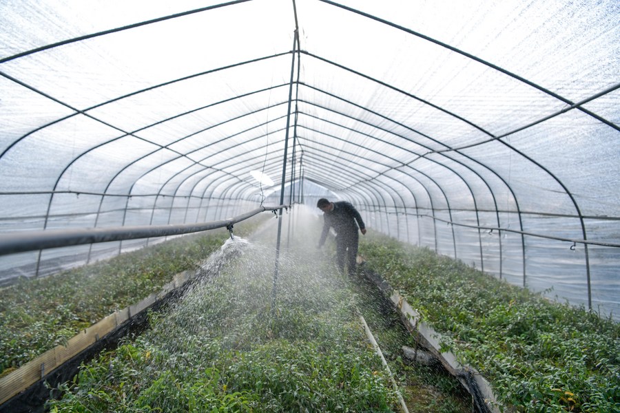 Un employé arrose des semis avec un système automatique dans une base de semis dans le bourg de Guandong du district de Congjiang, dans la préfecture autonome Miao et Dong de Qiandongnan, dans la province chinoise du Guizhou (sud-ouest), le 15 février 2023. (Photo : Yang Wenbin)