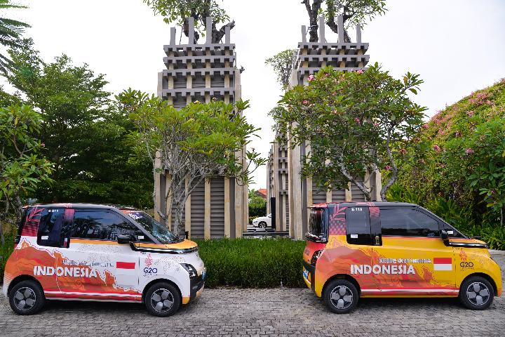 Photo prise le 12 novembre 2022 montrant des véhicules électriques Wuling sur le site principal du 17e Sommet du Groupe des 20 (G20) à Bali, en Indonésie. (Xinhua/Xu Qin)