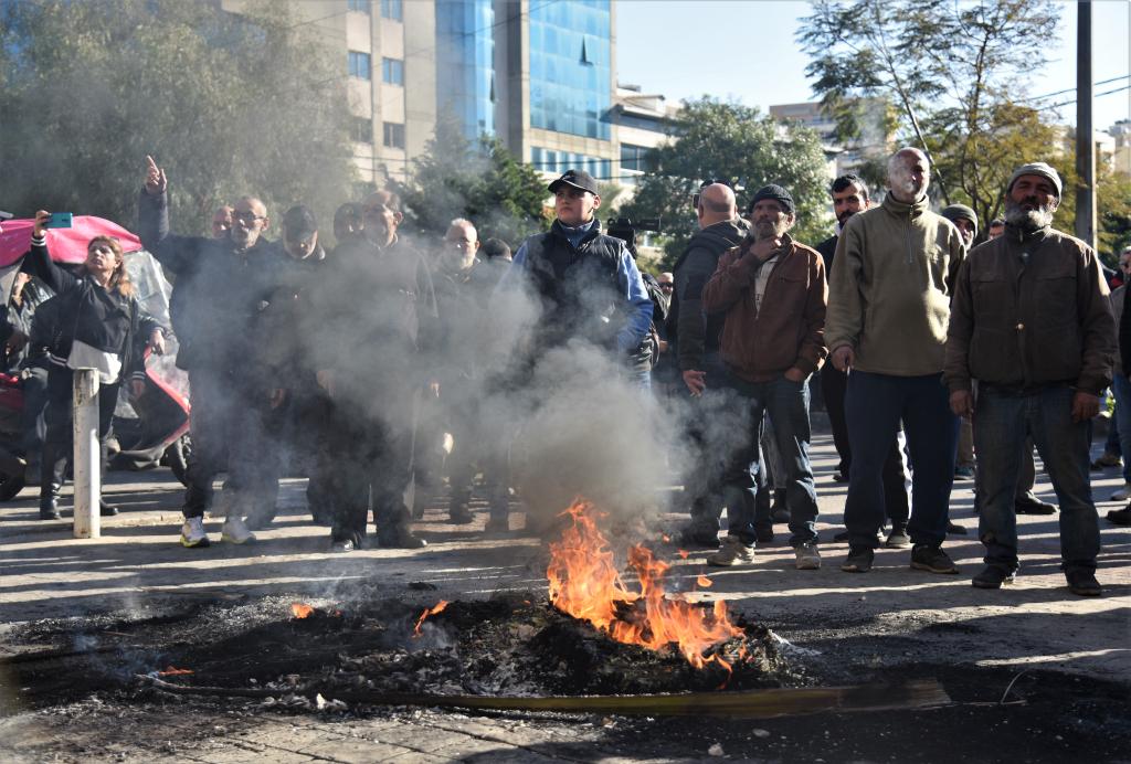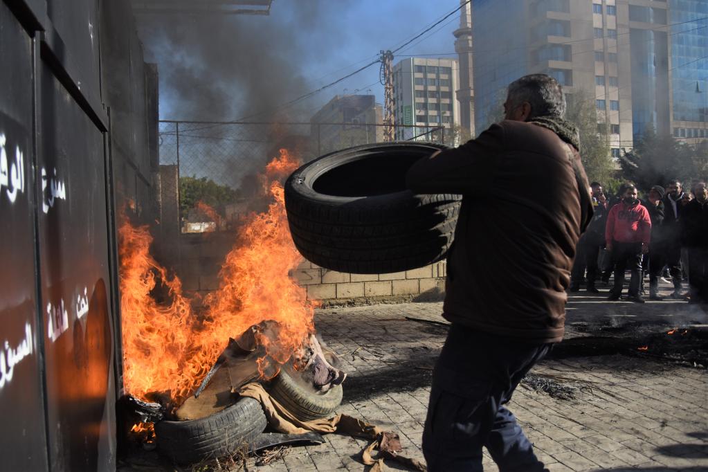 TRIPOLI, 20 février (Xinhua) -- Un homme se prépare à brûler un pneu lors d'une manifestation réclamant la stabilisation des prix et l'amélioration des conditions de vie devant la Banque du Liban à Tripoli, au Liban, le 20 février 2023. (Xinhua/Khaled Habashiti)