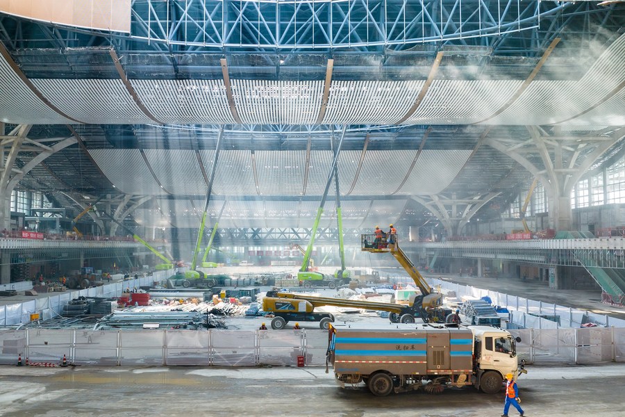 Des ouvriers installent le plafond suspendu dans le hall d'attente de la gare du Nord de Xiamen de la nouvelle ligne ferroviaire à grande vitesse Fuzhou-Xiamen, à Xiamen, dans la province chinoise du Fujian (sud-est), le 23 février 2023. (Photo : Lin Shanchuan)