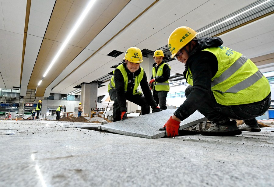 Des ouvriers posent des carreaux de sol à la gare du Sud de Fuzhou à Fuzhou, dans la province chinoise du Fujian (sud-est), le 21 février 2023. (Photo : Lin Shanchuan)