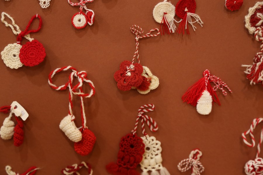 Des Martenitsi vues dans un musée de Sofia en Bulgarie, le 1er mars 2023. Le 1er mars, les Bulgares célèbrent la journée nommée Baba Marta. Le jour même et quelques jours après, les gens échangent et portent la "Martenitsa", une petite pièce de parure faite de fil blanc et rouge. (Xinhua/Lin Hao)■