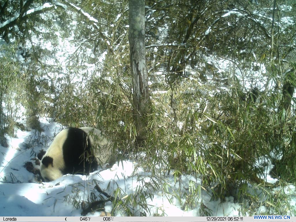 CHENGDU, 6 mars (Xinhua) -- Lors d'une patrouille de terrain, un membre du personnel du Parc national des pandas géants de la Chine a découvert deux pandas géants sauvages se faisant la cour.