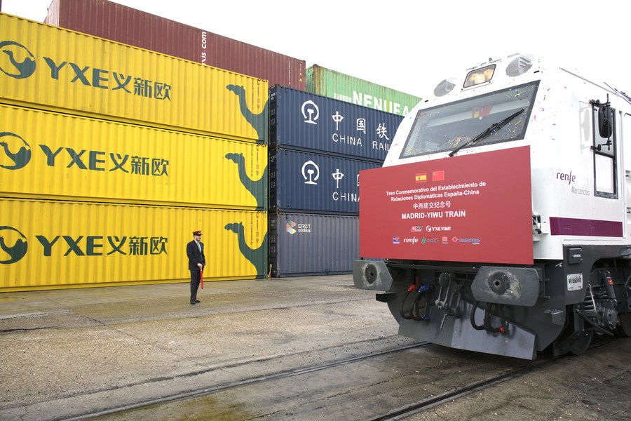 Un train de marchandises à destination de Yiwu en Chine part de Madrid, en Espagne, le 9 mars 2023. (Xinhua/Meng Dingbo)