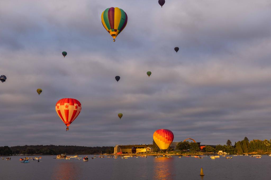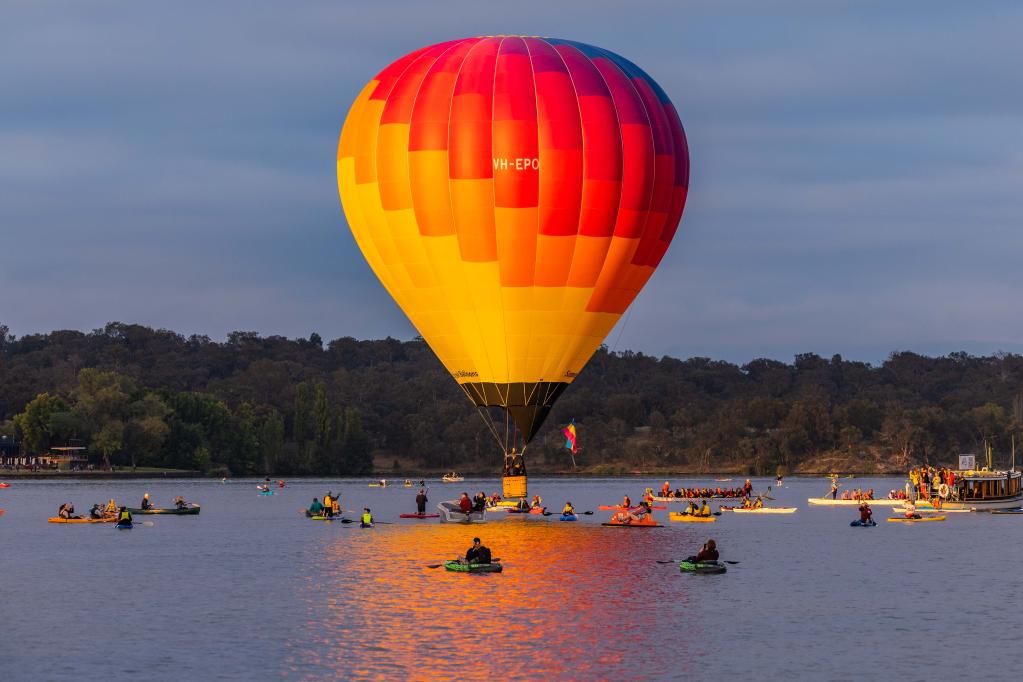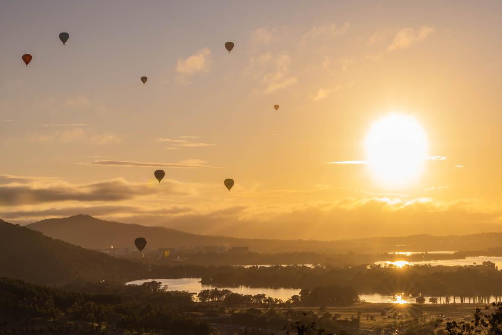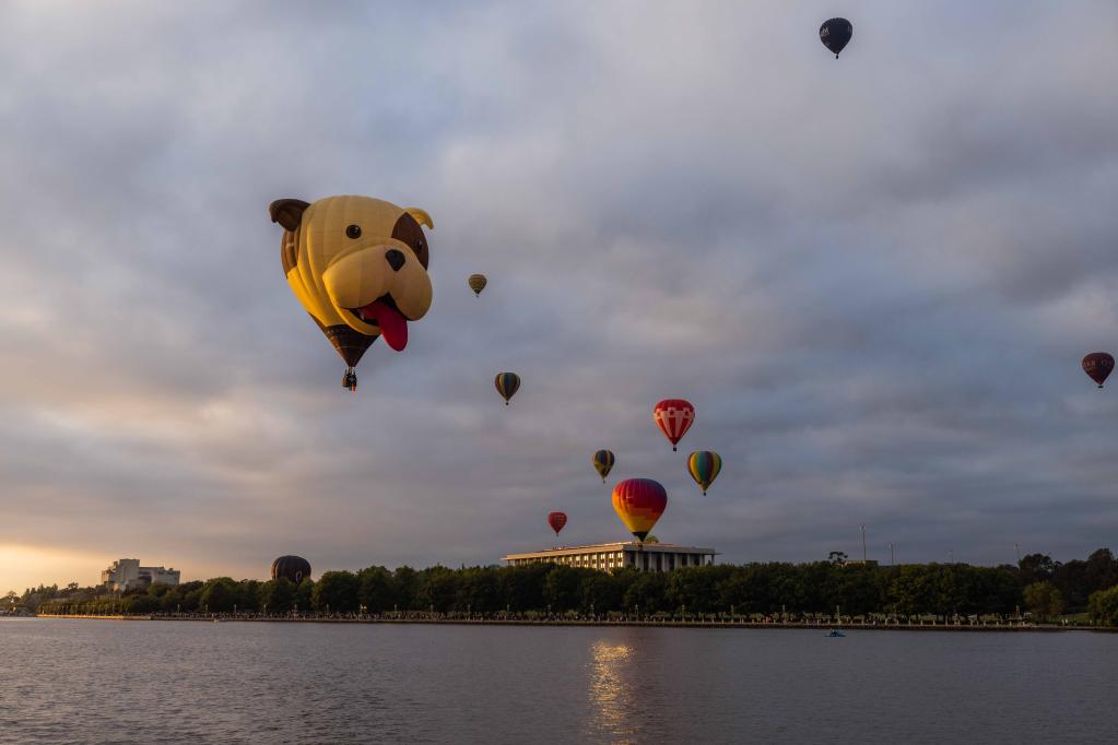 Des montgolfières survolent le lac Burley Griffin lors du festival annuel Canberra Balloon Spectacular à Canberra, en Australie, le 12 mars 2023. Le festival de montgolfières se tient cette année du 11 au 19 mars. (Xinhua/Chu Chen)