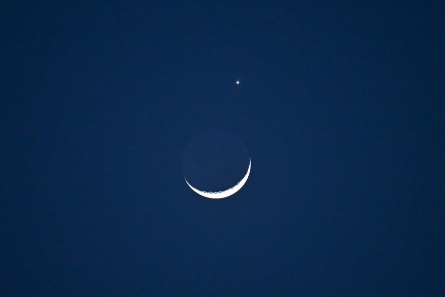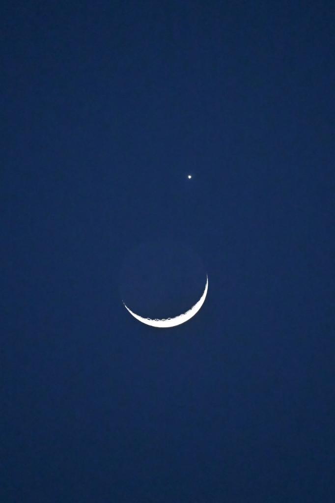 Photo prise à Beijing de la planète Vénus et d'un croissant de lune, le 24 mars 2023. (Photo : Li Xin)