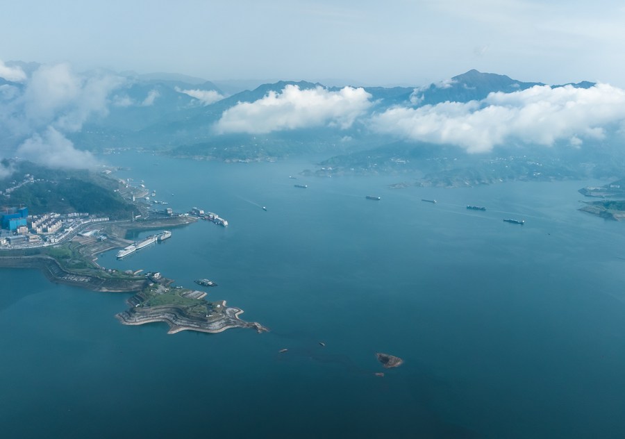 Photo aérienne de bateaux dans les eaux en amont du barrage des Trois Gorges, dans le district de Zigui de la ville de Yichang, dans la province chinoise du Hubei (centre), le 6 avril 2023. (Photo : Zheng Jiayu)