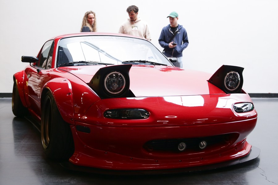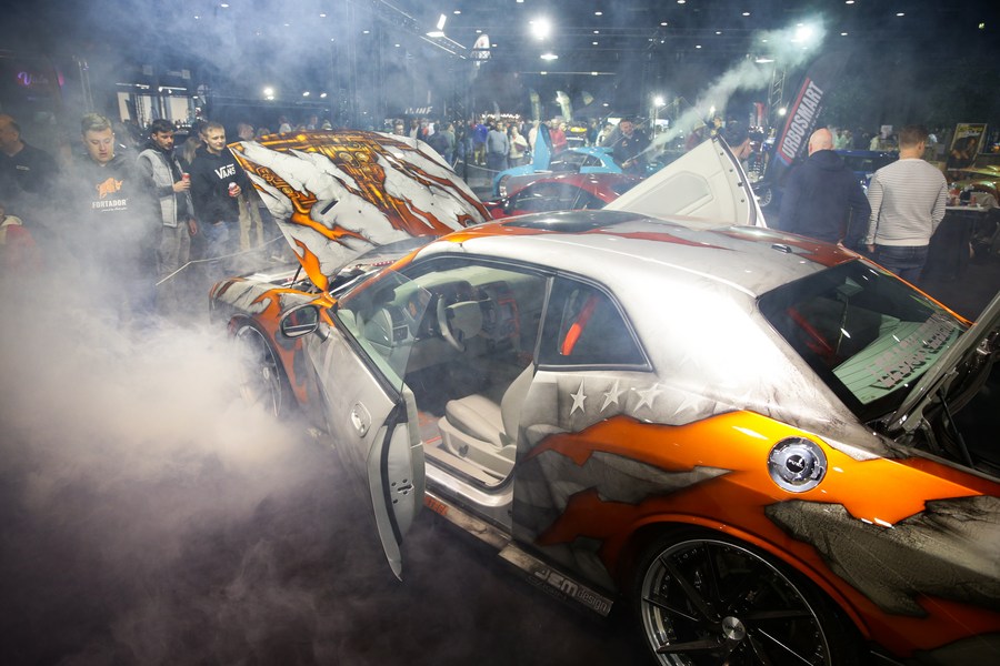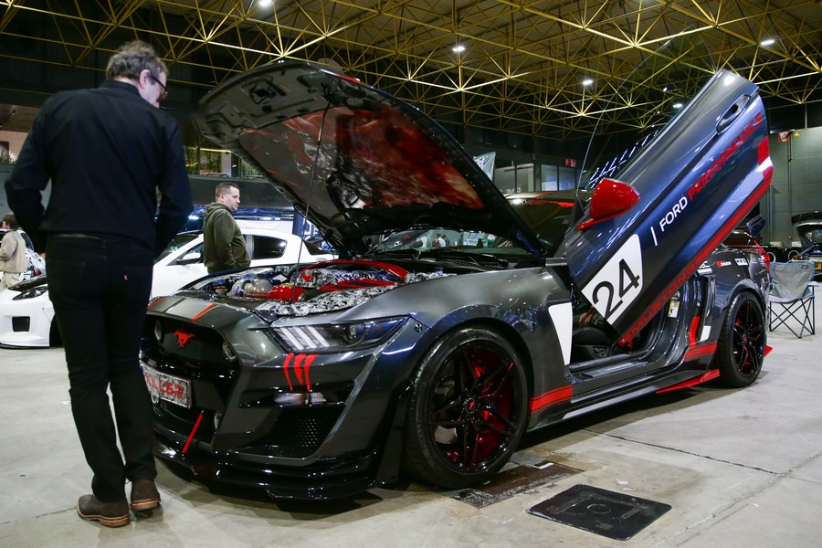 COURTRAI (Belgique), 17 avril (Xinhua) -- Des visiteurs observent une voiture exposée au Salon international de l'automobile GR8 à Courtrai, en Belgique, le 16 avril 2023. Plus de 1.000 voitures neuves et d'occasion du monde entier, y compris des voitures tunées, des voitures de collection et des voitures de sport, ont été exposées pendant le salon. (Xinhua/Zheng Huansong)