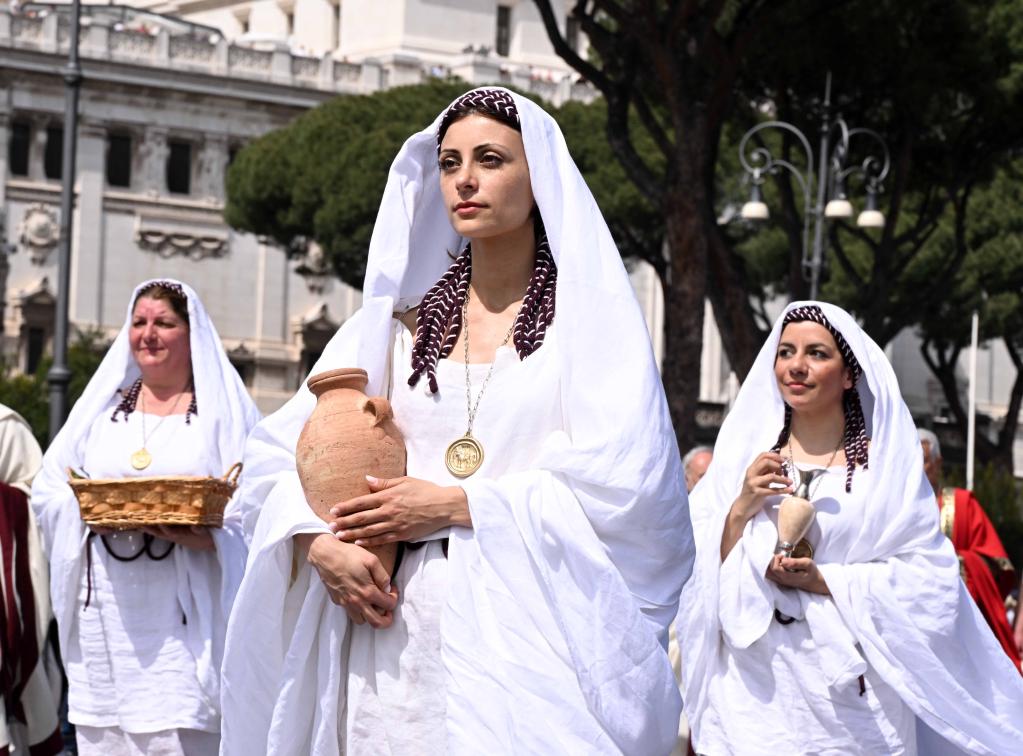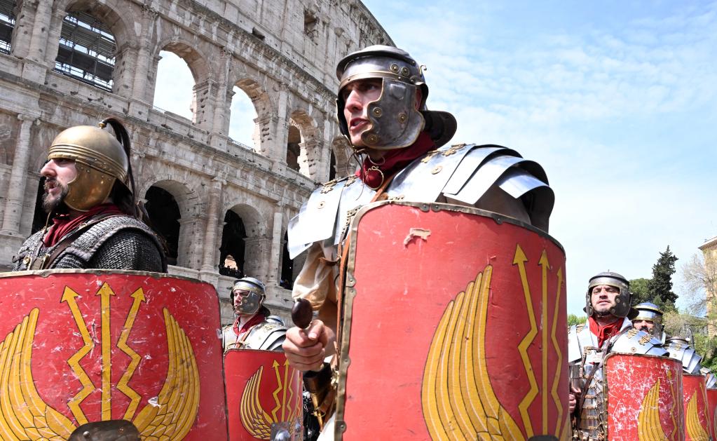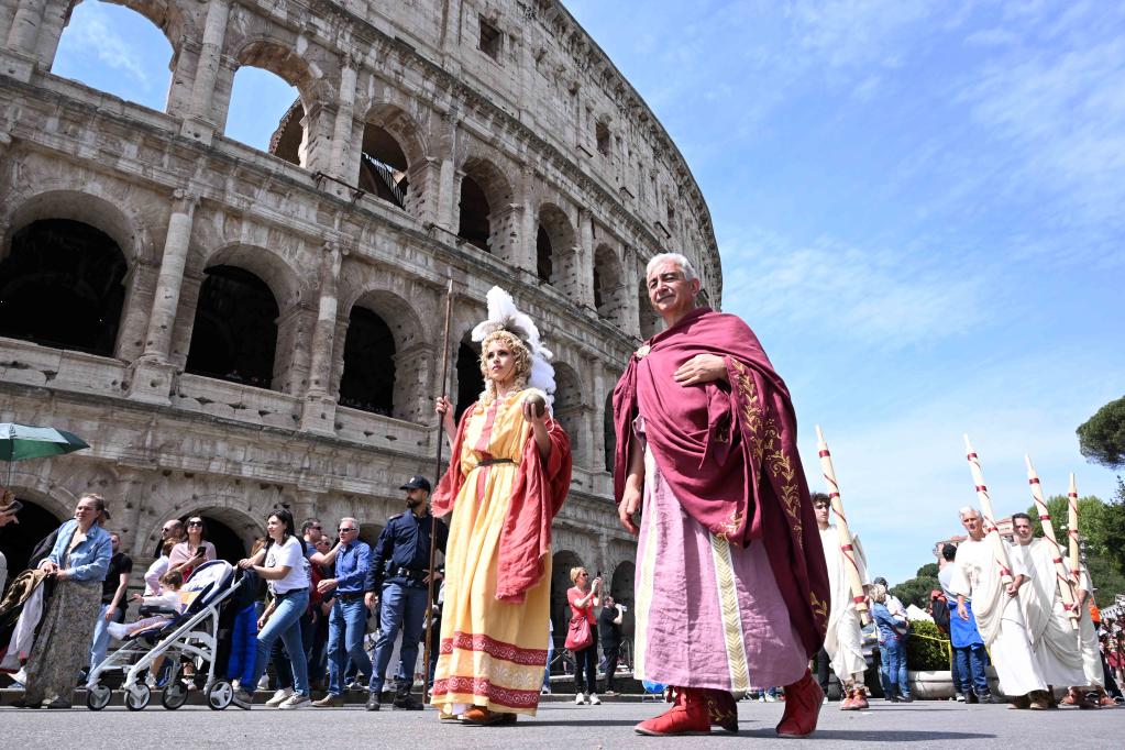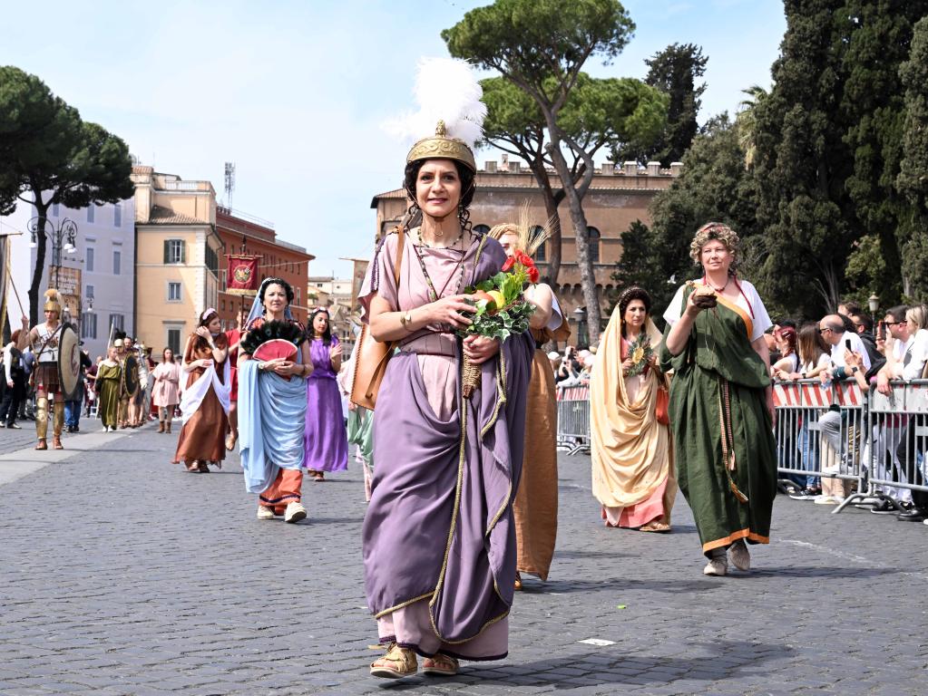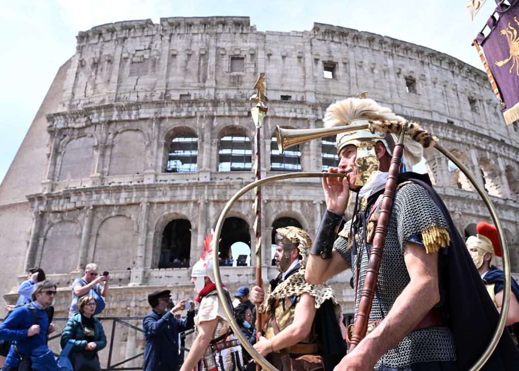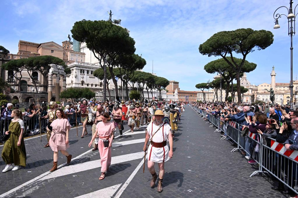 Des artistes participent à un défilé pour célébrer le 2.776e anniversaire de Rome, dans la capitale italienne, le 23 avril 2023. (Xinhua/Alberto Lingria)