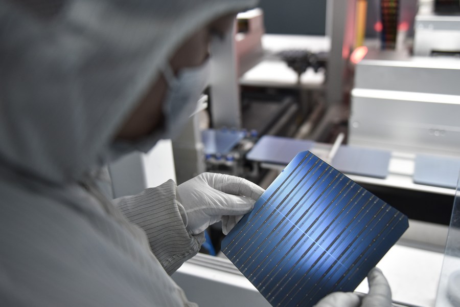 Un ouvrier travaille dans l'atelier d'un fabricant de modules photovoltaïques à Xining, dans la province du Qinghai, dans le nord-ouest de la Chine, le 22 février 2023. (Xinhua/Wu Gang)