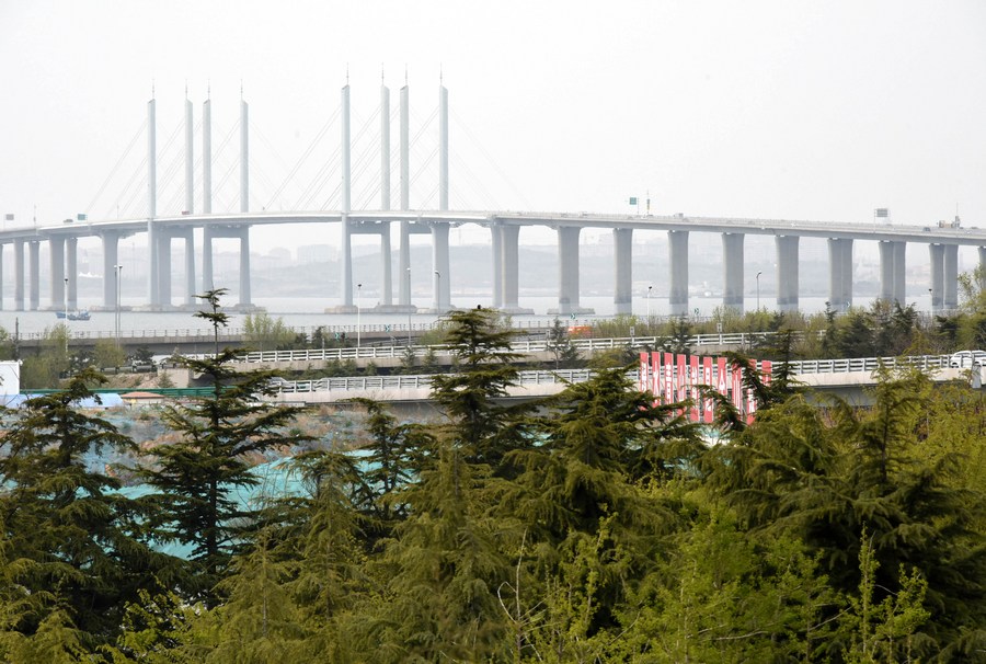 Photo aérienne du pont de la baie de Jiaozhou, à Qingdao, dans la province chinoise du Shandong (est), le 14 avril 2023. (Photo : Li Ziheng)