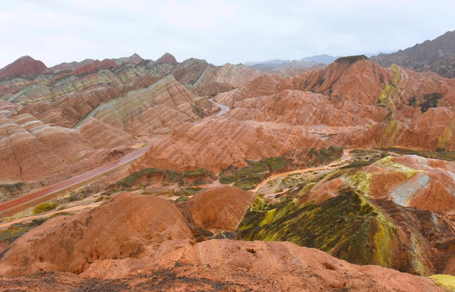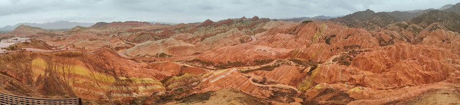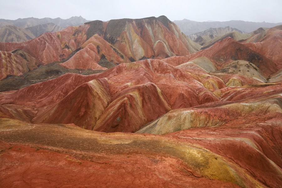 Vue panoramique du site touristique de Qicai Danxia sous la pluie, dans le parc géologique national de Zhangye Danxia, à Zhangye, ville de la province chinoise du Gansu (nord-ouest), le 8 mai 2023. (Photo : Ma Xiping)