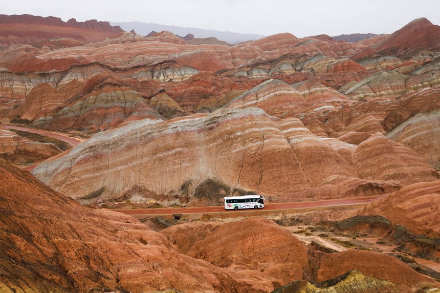 Le site touristique de Qicai Danxia sous la pluie, dans le parc géologique national de Zhangye Danxia, à Zhangye, ville de la province chinoise du Gansu (nord-ouest), le 8 mai 2023. (Photo : Ma Xiping)