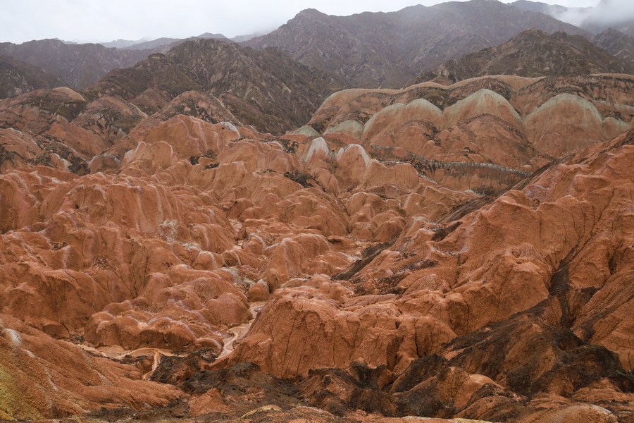 Le site touristique de Qicai Danxia sous la pluie, dans le parc géologique national de Zhangye Danxia, à Zhangye, ville de la province chinoise du Gansu (nord-ouest), le 8 mai 2023. (Photo : Ma Xiping)■