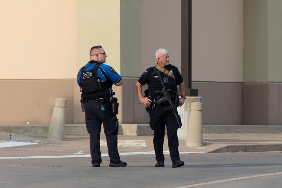 Photo prise le 6 mai 2023 montrant des policiers près des lieux de la fusillade au Allen Premium Outlets d'Allen, une ville de la banlieue de Dallas, au Texas, aux Etats-Unis. (Xinhua/Tian Dan)