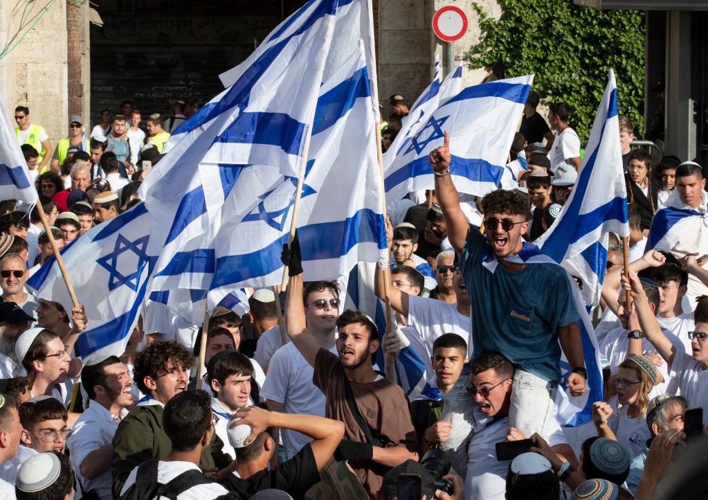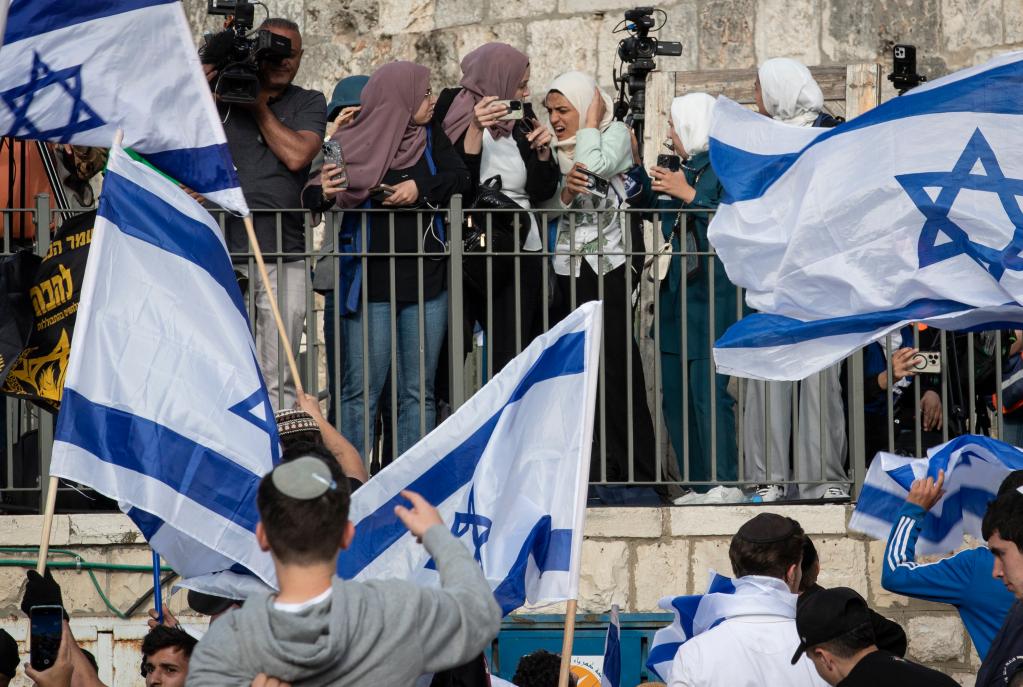 JERUSALEM, 18 mai (Xinhua) -- Des manifestants lors de la "marche des drapeaux" à Jérusalem, le 18 mai 2023. Des dizaines de milliers de nationalistes israéliens ont défilé jeudi dans la Vieille Ville de Jérusalem pour marquer l'annexion de la partie orientale de la Ville sainte par Israël, certains d'entre eux scandant des slogans racistes à l'encontre des Palestiniens, selon la police. (Xinhua/Chen Junqing)