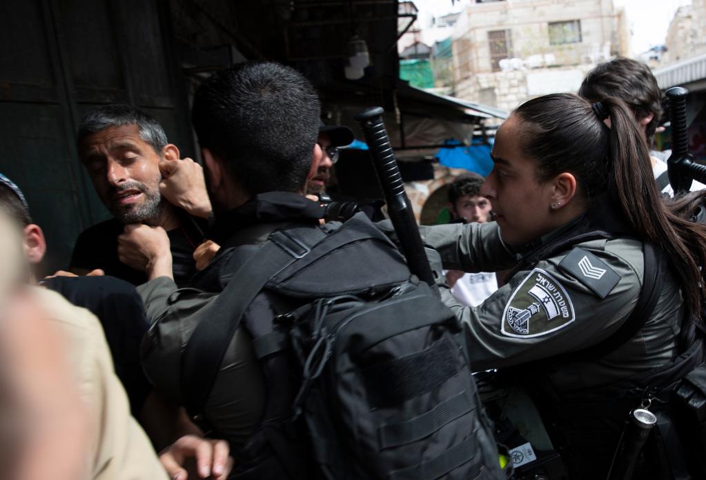 Des policiers israéliens s'opposent à un journaliste lors de la "marche des drapeaux" à Jérusalem, le 18 mai 2023. (Xinhua/Chen Junqing)