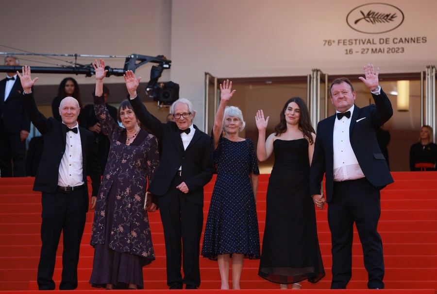 Le réalisateur britannique Ken Loach (3e à gauche) et des membres de l'équipe du film "The Old Oak" arrivent pour la projection du film lors de la 76e édition du Festival de Cannes, dans le sud de la France, le 26 mai 2023. (Xinhua/Gao Jing)