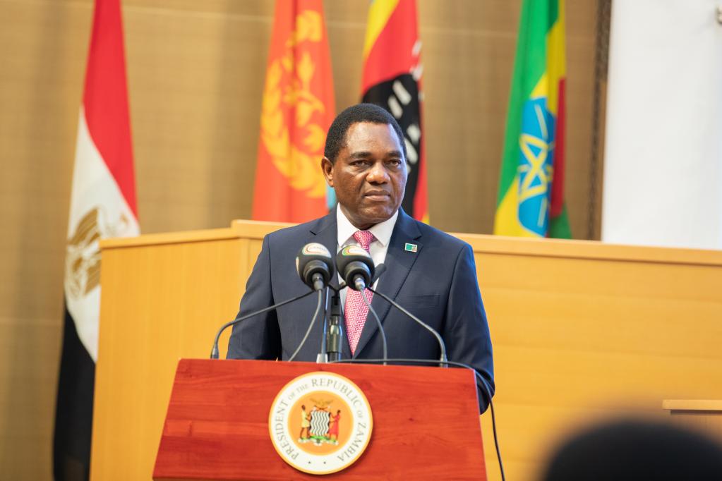 LUSAKA, 9 juin (Xinhua) -- Le président zambien Hakainde Hichilema s'exprime lors du 22e sommet des chefs d'Etat et de gouvernement du Marché commun de l'Afrique orientale et australe (COMESA) à Lusaka, en Zambie, le jeudi 8 juin 2023. Le sommet s'est ouvert jeudi à Lusaka, les dirigeants appelant à accélérer les efforts pour parvenir à l'intégration économique. (Xinhua/Peng Lijun)