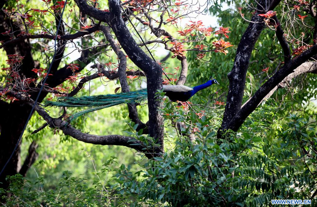 Un paon perché sur un arbre au Palais présidentiel indien à New Delhi, en Inde, le 30 mai 2023. (Str/Xinhua)
