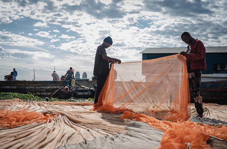 MWANZA (Tanzanie), 15 juin (Xinhua) -- Des pêcheurs préparent leurs filets sur les rives du lac Victoria dans la région de Mwanza, en Tanzanie, le 10 juin 2023. Le lac Victoria, situé dans la vallée du Rift en Afrique de l'Est, est le plus grand lac d'eau douce d'Afrique et le deuxième plus grand lac d'eau douce du monde. La pêche en est la principale industrie, avec une production annuelle d'une valeur de 600 millions de dollars. Elle constitue une source essentielle de nourriture et de revenus pour les riverains. (Xinhua/Wang Guansen)